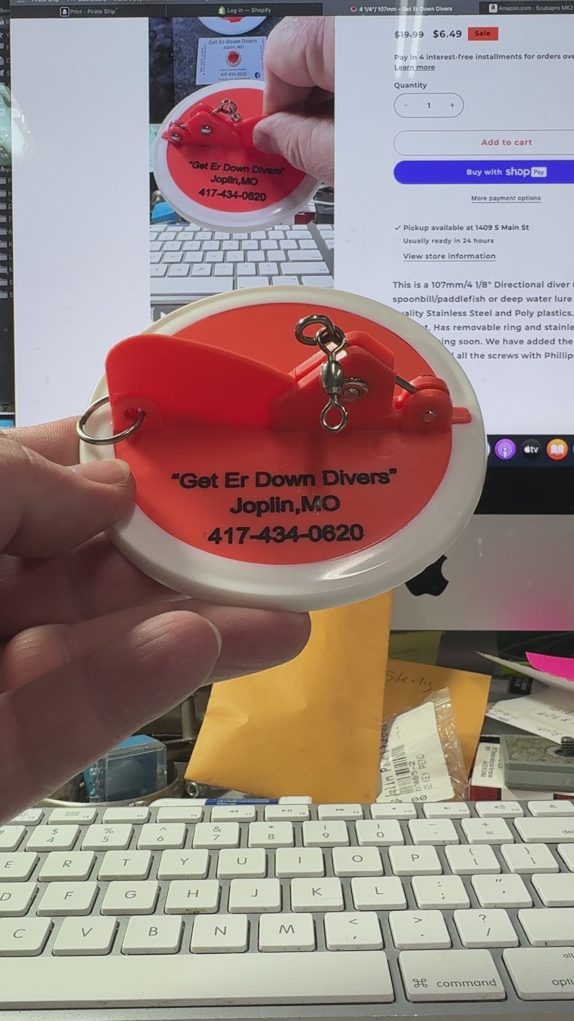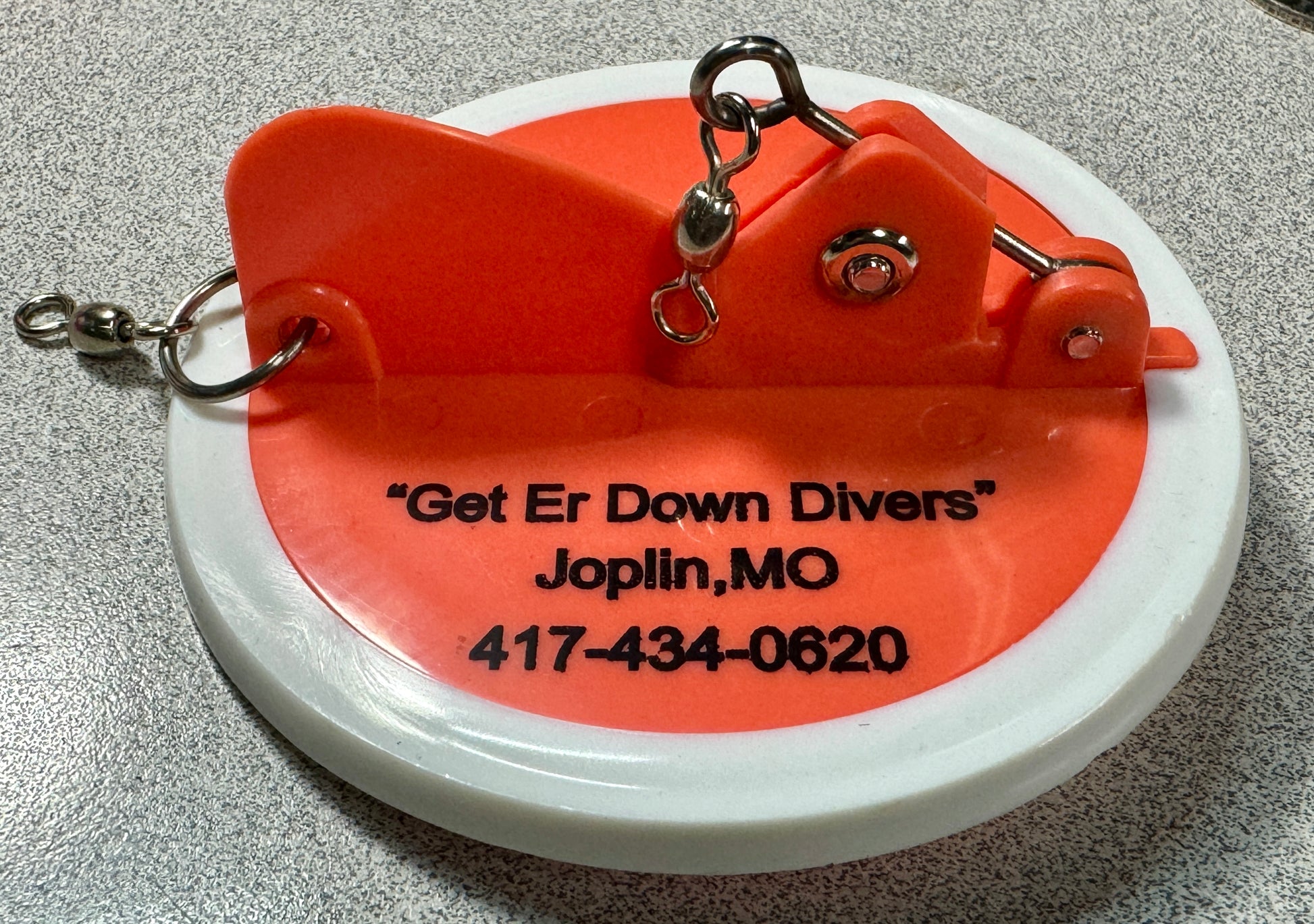 This is the new and improved 107mm/4 1/8" Directional diver used for spoonbill/paddlefish or deep water lure fishing. This Diver can dive down to 50 feet but works much better at 40-45 max depth. Made of high quality Stainless Steel and Poly plastics. This is a high quality product. Has removable ring and stainless steel trip arm. This is the new and improved version. Has Phillips head screws on all screw adjustments and now has the clicker on the bottom plate to keep plate from rotating around.