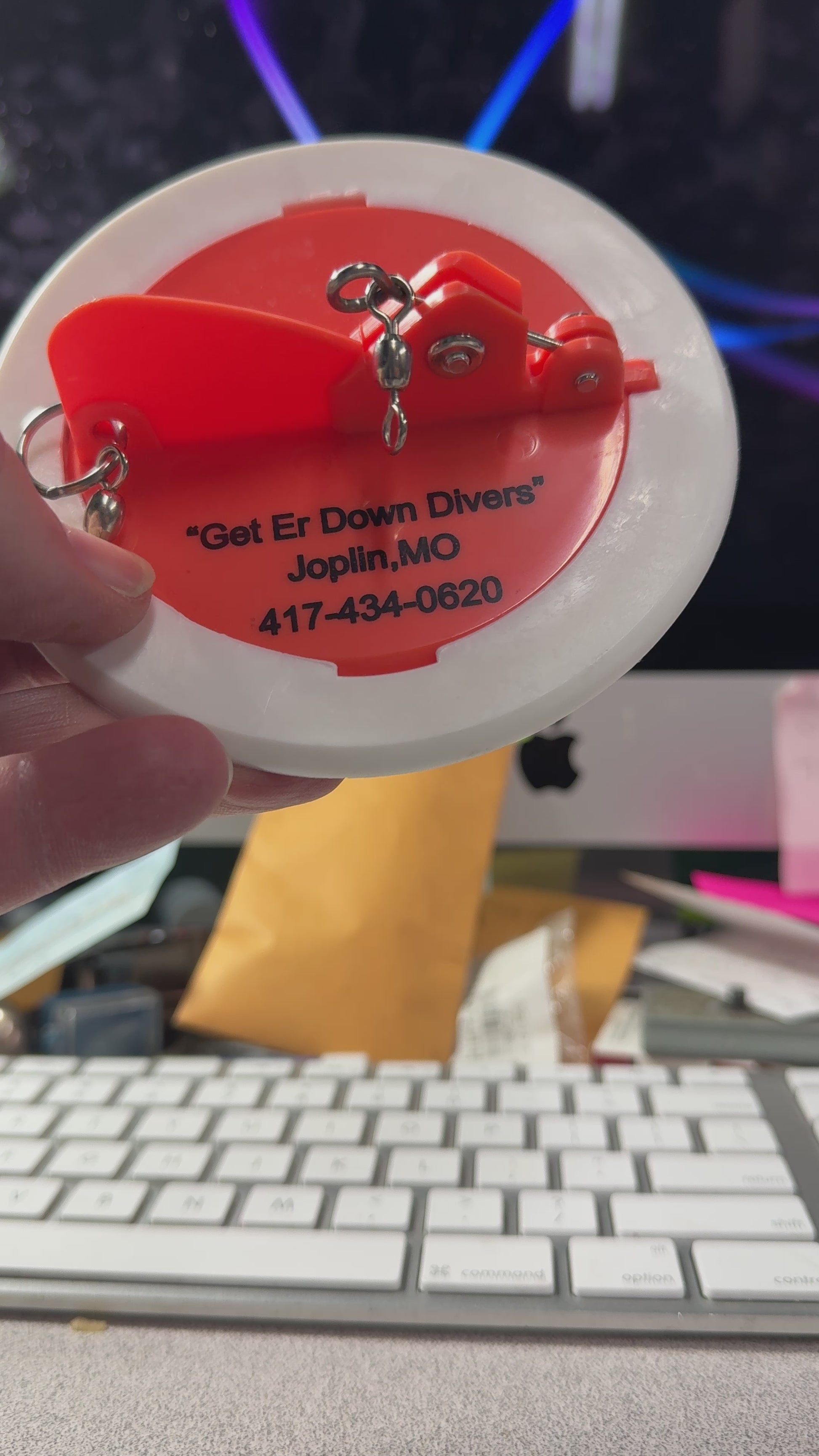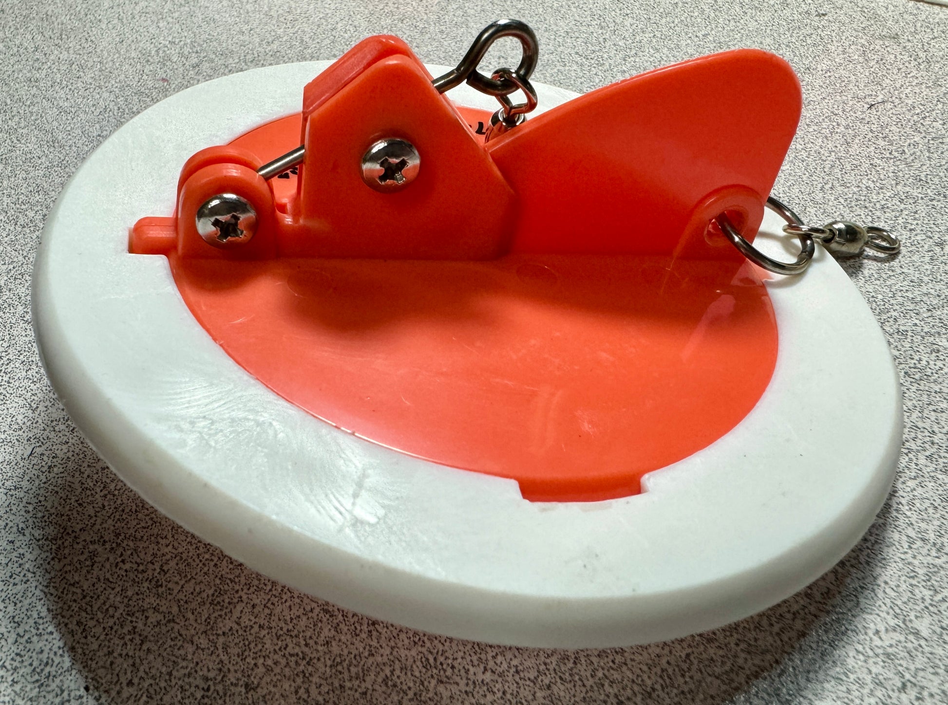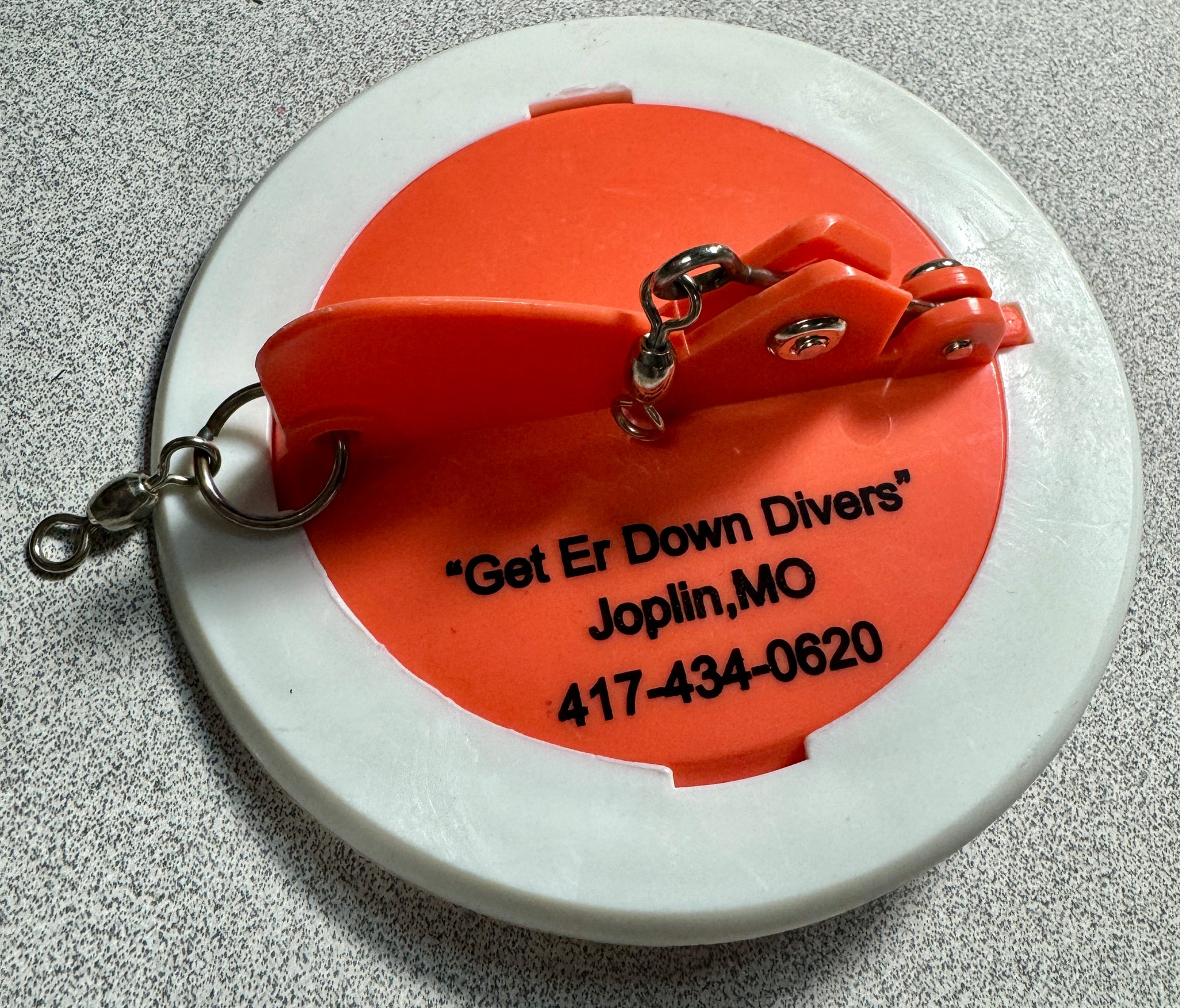 This is the new and improved 124mm/4 7/8” Directional diver used for spoonbill/paddlefish or deep-water trolling. This size diver can take hook or bait down to depths of 100 feet. It has a larger ring diameter and has about 3 times the amount of weight in the bottom plate. Our divers are Made of high-quality Stainless Steel and Poly plastics. This is a high-quality product. Has removable ring and stainless steel trip arm. New Style with the upgraded Clicker on the bottom plate and all the screws will be Phillips head.